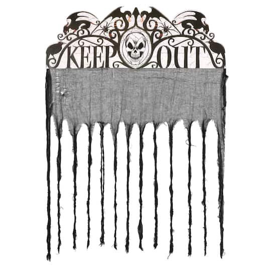 Buy the 4ft. Black Keep Out Door Curtain by Ashland at Michaels. Featuring an intricate carved design with a skull and the words 'Keep Out,' hang this creepy decor over your front door to give your Ha…