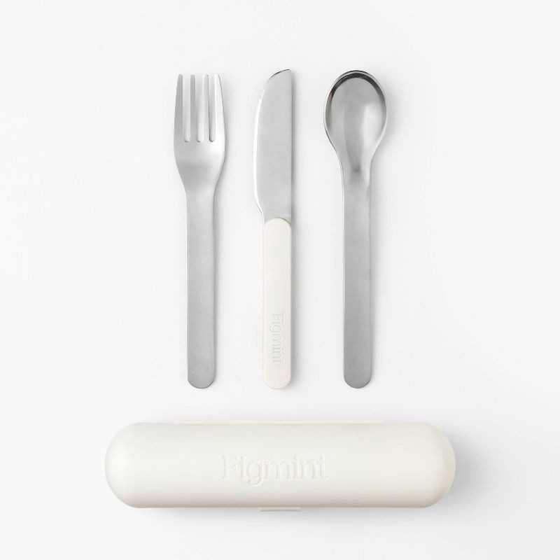 This 4-Piece Flatware and Carrier Set from Figmint™ makes it easy to enjoy lunch or snacks while traveling or commuting. This flatware set includes a stainless steel fork, knife and spoon, plus a crea…