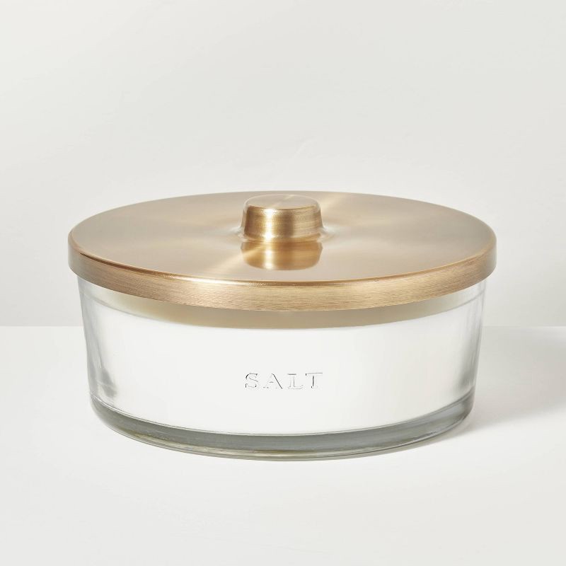 Transport your senses seaside with the 5-Wick Clear Glass Salt Knob-Lid Jar Candle from Hearth & Hand™ with Magnolia. This clear glass jar candle is designed in a round bowl shape and has a gold-tone …