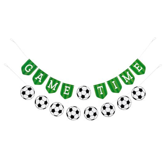 Buy the 5ft. Green, Black & White Game Time Soccer Banner Set by Celebrate It at Michaels. Featuring a green, black and white design with the words "Game Time" and soccer balls, hang behind your snackā¦