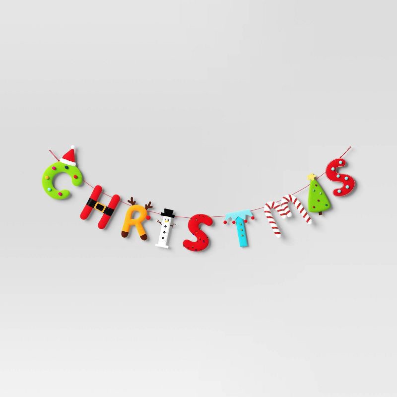 Add a colorful accent to your seasonal decor with the 6-Foot Colorful Fabric 'Christmas' Decorative Wall Garland from Wondershop™. This decorative garland features "Christmas" with fun holiday decorat…