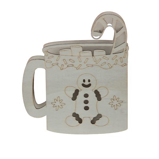 Purchase the 6" Gingerbread Mug DIY LED Wood Decor by Make Market at Michaels. This gingerbread man mug with marshmallows and a candy cane design inside features a light-up pink LED light that glows t…