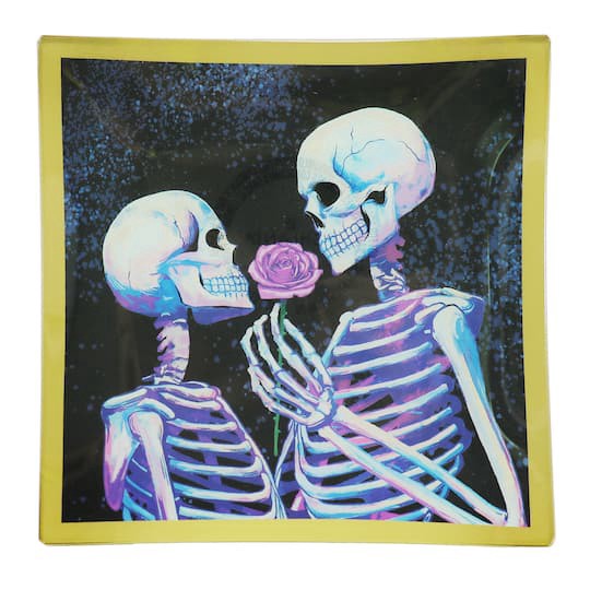 Buy the 6" x 6" Skeletons Glass Plate by Ashland at Michaels. This glass plate features a gazing skeleton couple with a rose suspended in hand between the two. It would be a great spot to keep candy a…