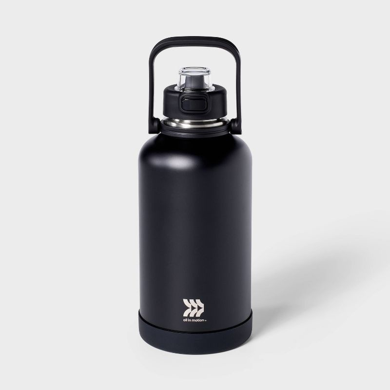 Why we're ALL IN:Stay hydrated during the day and throughout workouts with the 64-ounce water bottle. Made of stainless steel in a solid color, the insulated design keeps your drink cold, while the to…
