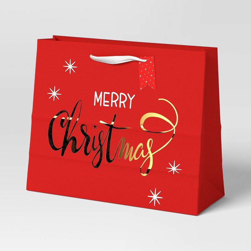 Make a sparkly statement at your holiday get-togethers with this Large Vogue 'Merry Christmas' Gift Bag and 6-Count Tissue from Wondershop™. This large vogue gift bag features the phrase "Merry Christ…