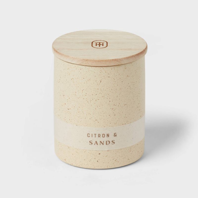 Experience serenity with the 6oz Matte Textured Ceramic Wooden Wick Candle in Ivory/Citron and Sands by Threshold™. The matte ceramic exterior, in a soothing ivory hue, complements any space. Ignite t…