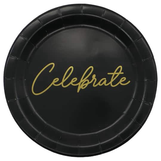 Buy these 7" Black & Gold Celebrate Snack Plates, 8ct. by Celebrate It at Michaels. Serve up tasty snacks in style with these trendy plates. Featuring a gold script "Celebrate" message, these disposab…
