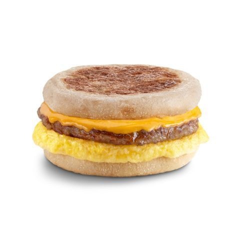 Soft english muffin with savory sausage, fluffy egg and melted cheese