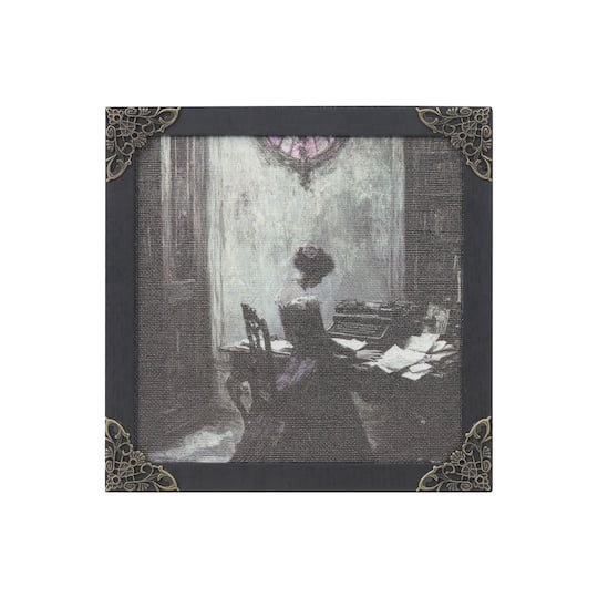 Find the 7" Reading Woman Tabletop Decor in Black Frame with Filigree Corners by Ashland at Michaels. A woman sits reading in the shadows in this spectral piece set in black frame with silver filigreeā¦
