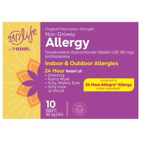 Fexofenadine hydrochloride tablets, 180mg/antihistamine Indoor and outdoor allergies 24 relief of sneezing, runny nose, itchy watery eyes, and itchy nose or throat