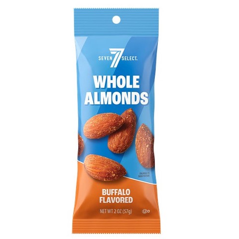 7-Select Buffalo Almonds are dry-roasted whole almonds seasoned with bold buffalo flavor for a tangy, delicious crunch in every bite