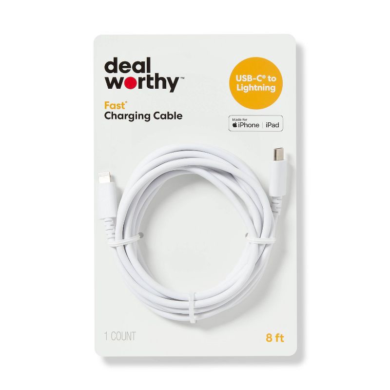 Charge your devices quickly with the 8' Lightning to USB-C Cable - dealworthy™ White. Compatible with iPhone 14 and older models and select iPads, this cable features a male-to-male connection, ensuri…