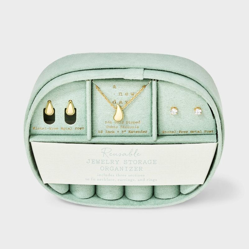 Upgrade your jewelry assortment with this 14K Gold-Dipped Cubic Zirconia Necklace and Huggie Stud Earring Set from A New Day™. Made from nickel-free metal in a gold-tone finish with sparkly CZ stone a…