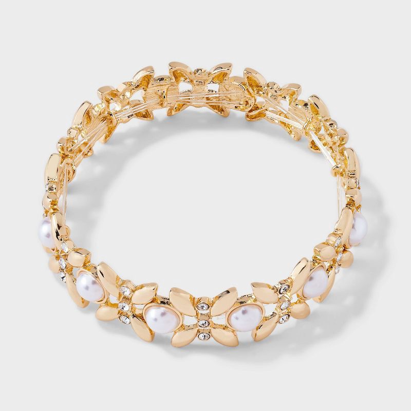 Add a touch of nature-inspired elegance to any outfit with this Pearl and Leaf Stretch Bracelet from A New Day™. This gold-tone bracelet features a beautiful leaf design with shiny crystal detailing a…