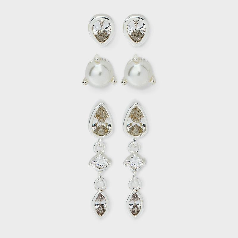 Dazzle every day of the week by styling your outfit with this 3-Piece Dangle Stud Earring Set from A New Day™. This set includes three pairs of silver plated earrings — studs with faux pearls in prong…