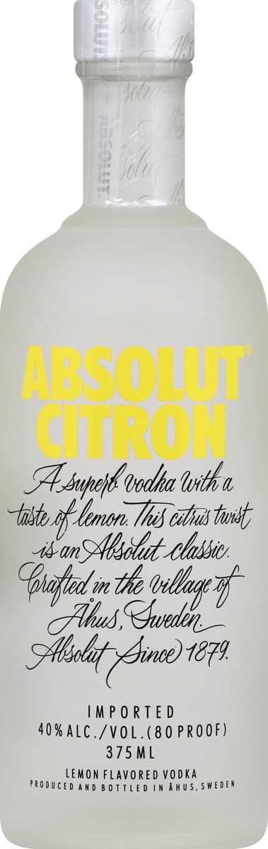 Citron. A superb vodka with a taste of lemon. This citrus twist is and Absolut classic. Crafted in the village of Ahus\, Sweden. Absolut since 1879. Imported. Enjoy responsibly visit responsibly.org. …