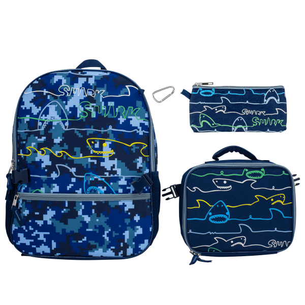 Accessory Innovations Shark Zone 3-Piece Backpack Set With 16"" Backpack, Lunch Box, Carabiner And Pencil Case, Blue