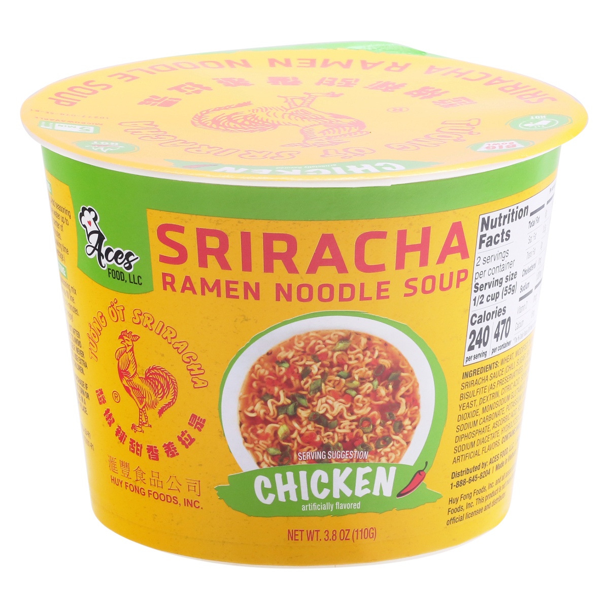 Artificially flavored. Big bowl. 5 min microwavable. hfsriracharamen.com. Made in Vietnam.