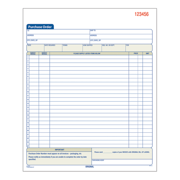 Carbonless purchase order books take the hassle out of paperwork Blue headline clearly indicates that forms are purchase order forms. Line-by-line categories make it easy to describe, identify and req…