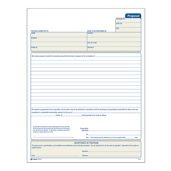 Large area for complete description of work proposed Includes space for customer to sign his/her acceptance of proposal. 1-part form includes carbons to create 2 part forms if necessary. Space at top …
