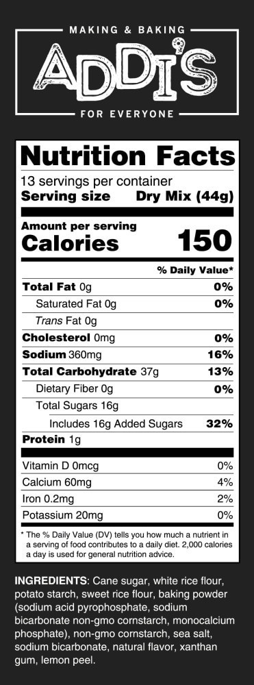 Cane Sugar, White Rice Flour, Potato Starch, Sweet Rice Flour, Baking Powder (Sodium Acid Pyrophosphate, Sodium Bicarbonate Non-Gmo Cornstarch, Monocalcium Phosphate), Non-Gmo Cornstarch, Sea Salt, So…