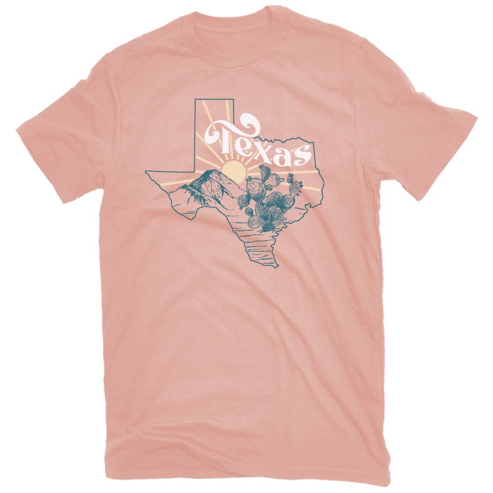 Texas State Love Themed T-Shirt. 140 GSM 60/40 Cotton Polyester Jersey. Front chest Texas Desert graphic.