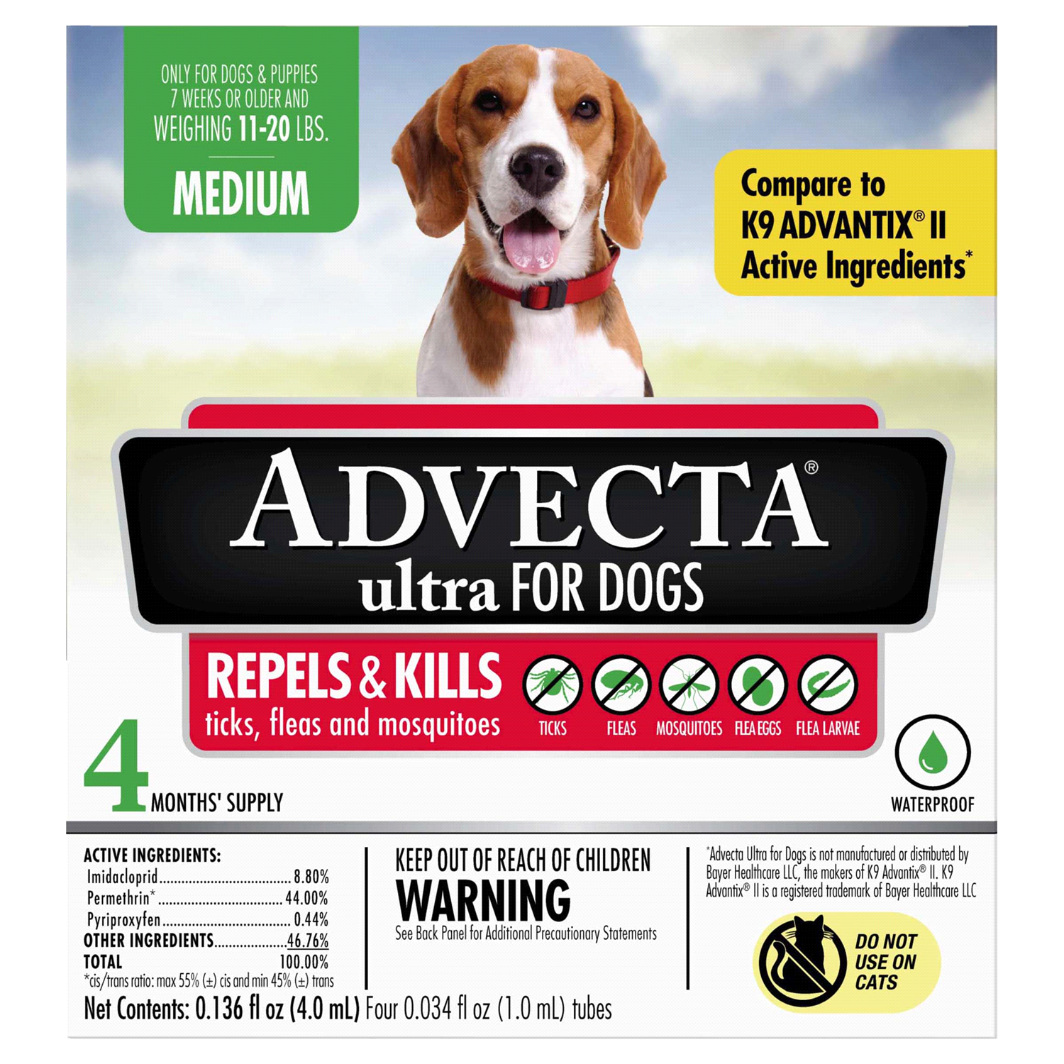 ADVECTA Ultra Flea and Tick Protection for Medium Dogs (11-20 lbs) contains the same active ingredients as K9 Advantix II for Dogs*. This waterproof, fast-acting formula kills and repels fleas, tick, …