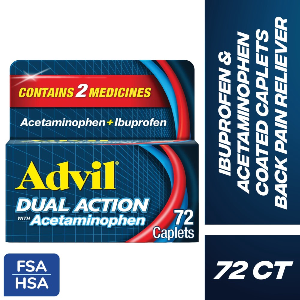 Advil Dual Action Back Pain Caplets combine two top selling pain fighting ingredients to fight back pain in two ways: acetaminophen blocks pain signals and ibuprofen targets pain caused by inflammatio…