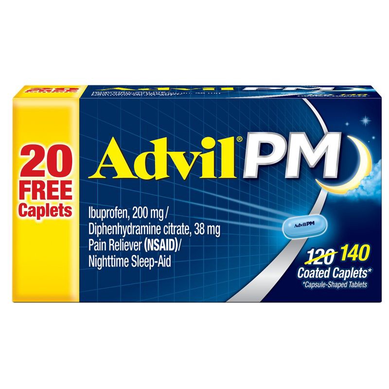 - 140 caplets of Advil PM Pain Reliever and Nighttime Sleep Aid, Ibuprofen for Pain ReliefIbuprofen PM relieves sleeplessness from aches with packaging with 20% less plastic by 2022Nighttime sleep aid and headache medicine that helps you fall asleep and stay asleepIbuprofen caplets are portable, so you can get a whole night's sleep whether you're at home or awayBack pain medicine and sleep aid for adults and children 12 years and olderHSA and FSA eligible product