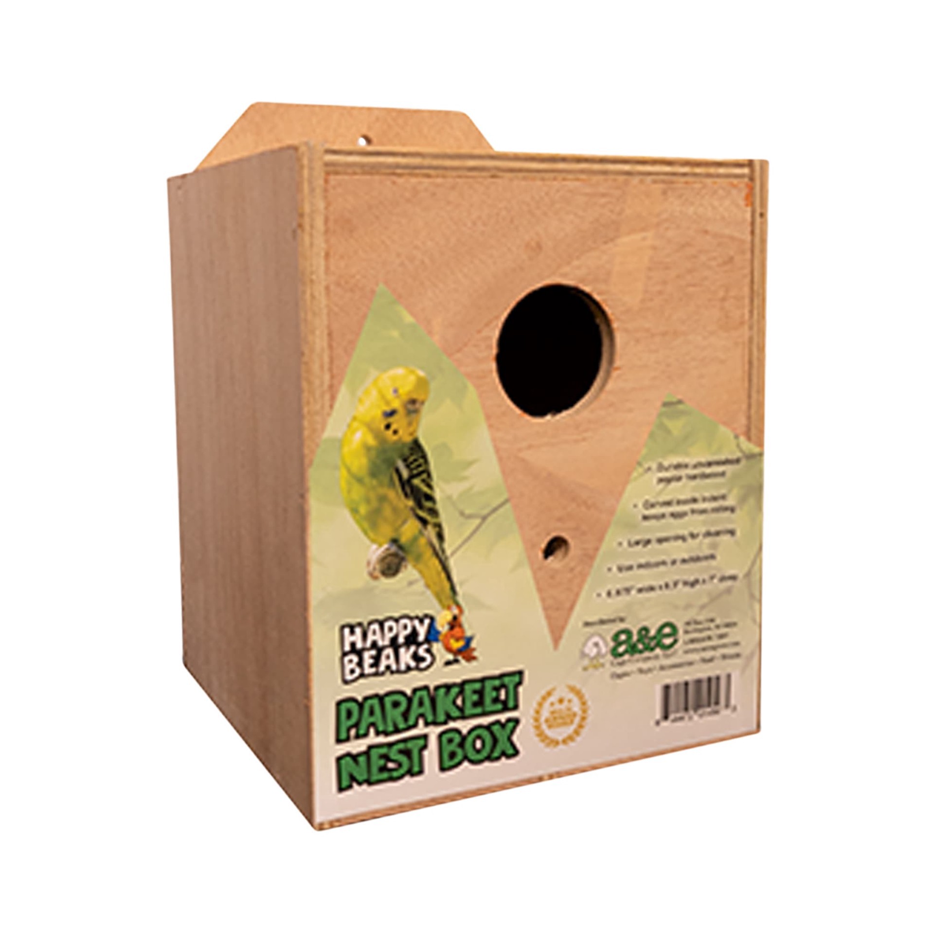 A&E Cage Parakeet Nest Box is built with hardwood and has an easy open top for cleaning and removal of nesting materials. Perch and Hanging hardware is included. Box measures 6.375" long, 7.875" wide,…