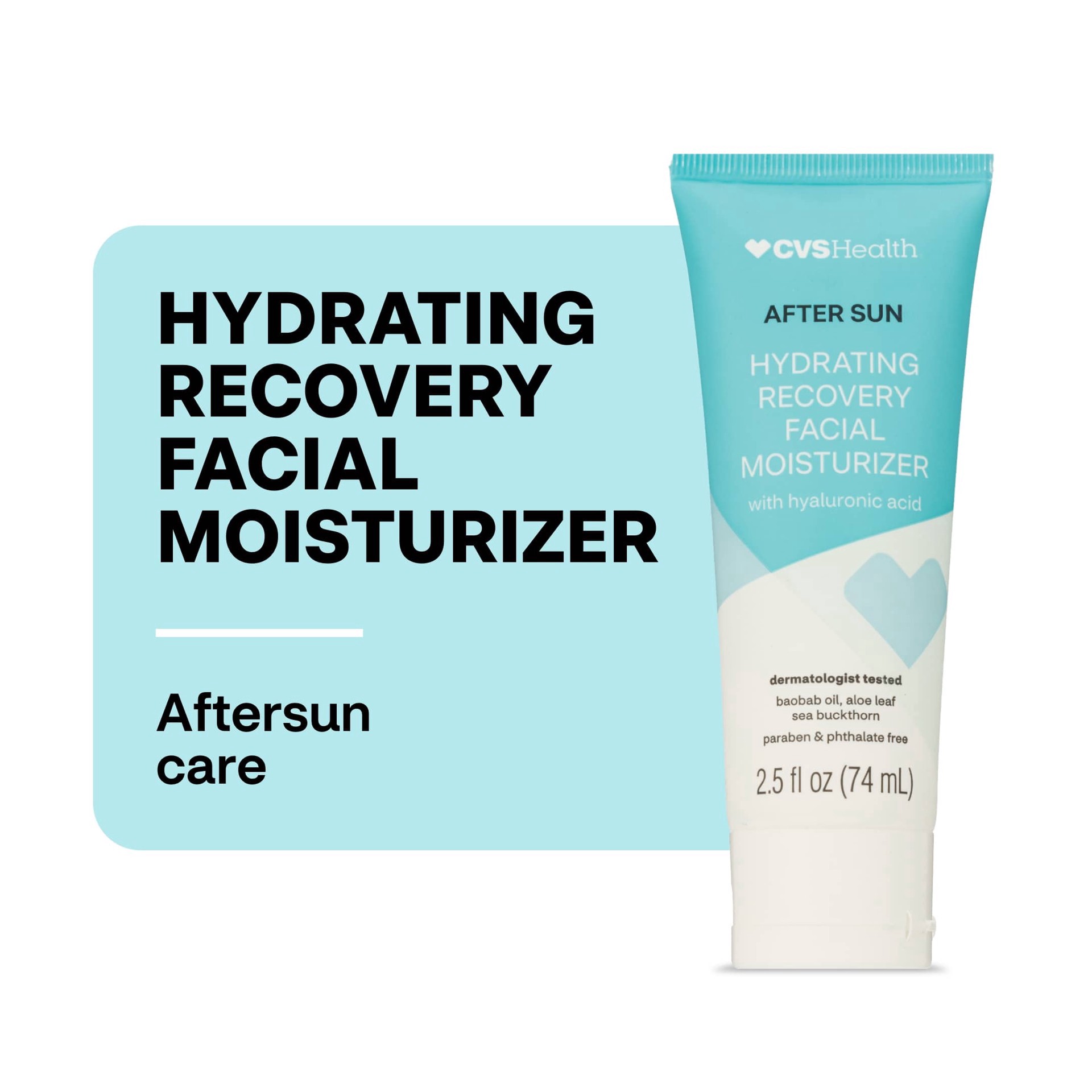 Facial moisturizer. Dermatologist tested. With hyaluronic acid. CVS Health quality. 2.5-oz. Get fast, intense relief from sunburn and dryness with CVS Health After Sun Hydrating Recovery Facial Moistu…