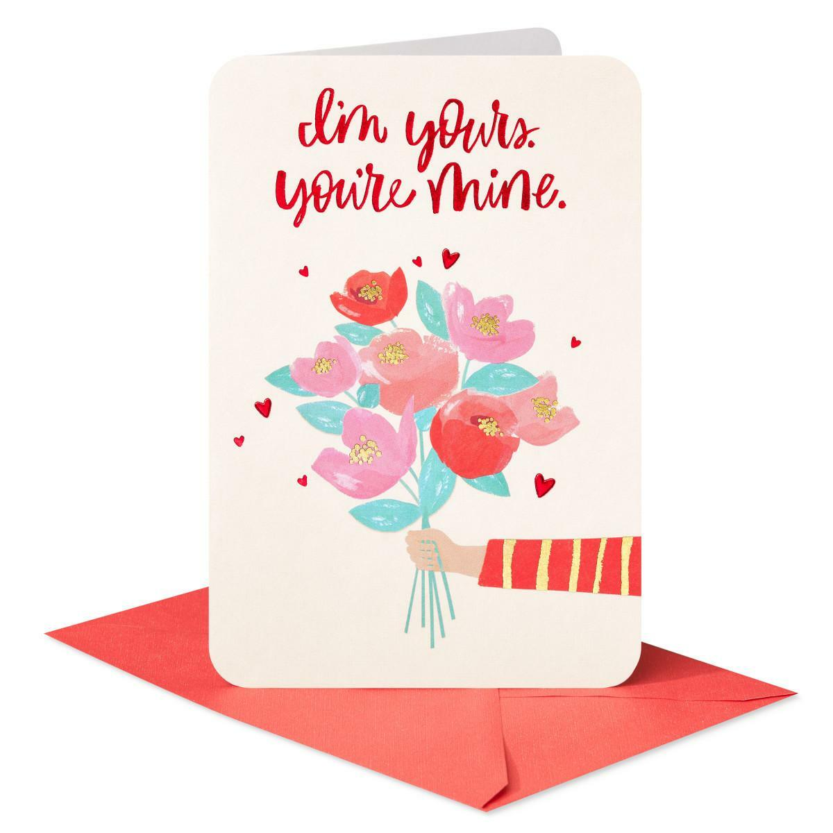 Send a bouquet of love with this sweet Valentine's Day wish! This cheerful design shows a person (not seen) offering a colorful array of flowers, with tiny floating heart accents and decorative letter…