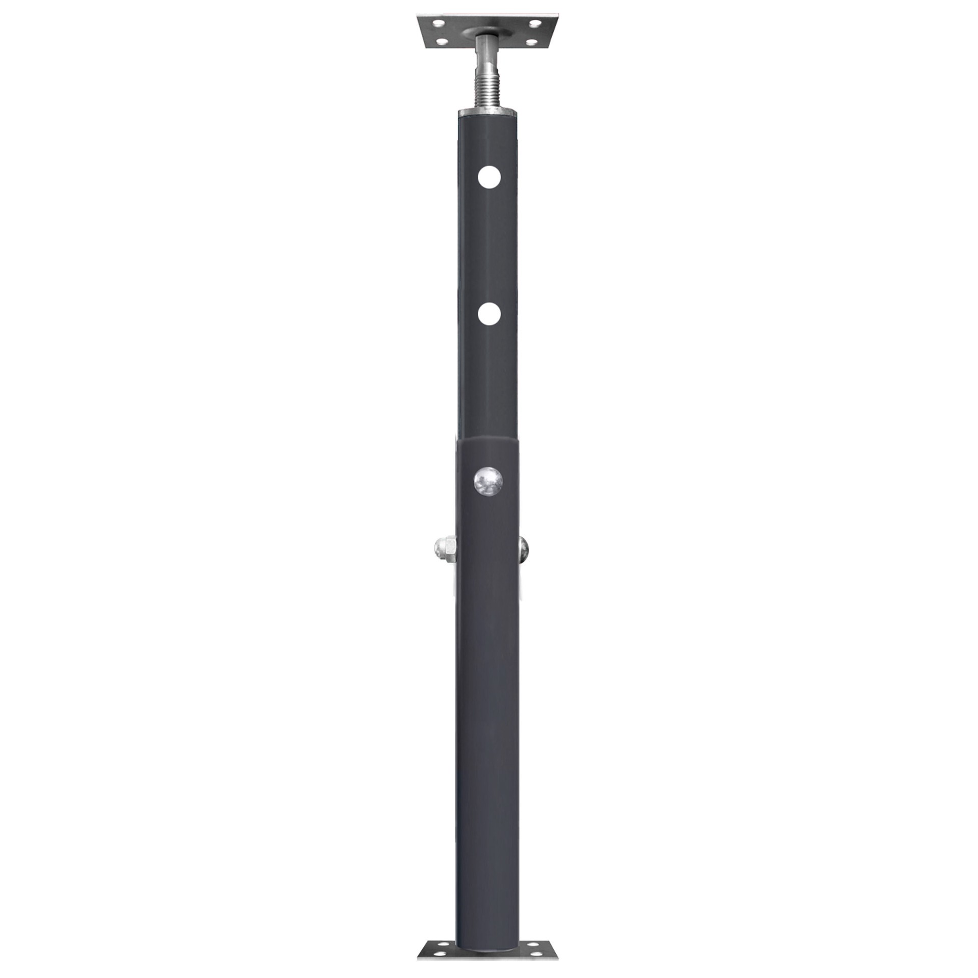 Made from heavy duty high carbon steel. Adjusts from 4-ft 8-in to 8-ft 4-in. Compression load range 18,000-lbs at min height to 9,100-lbs at max height. 4-in x 5-in galvanized plates, embossed to prev…