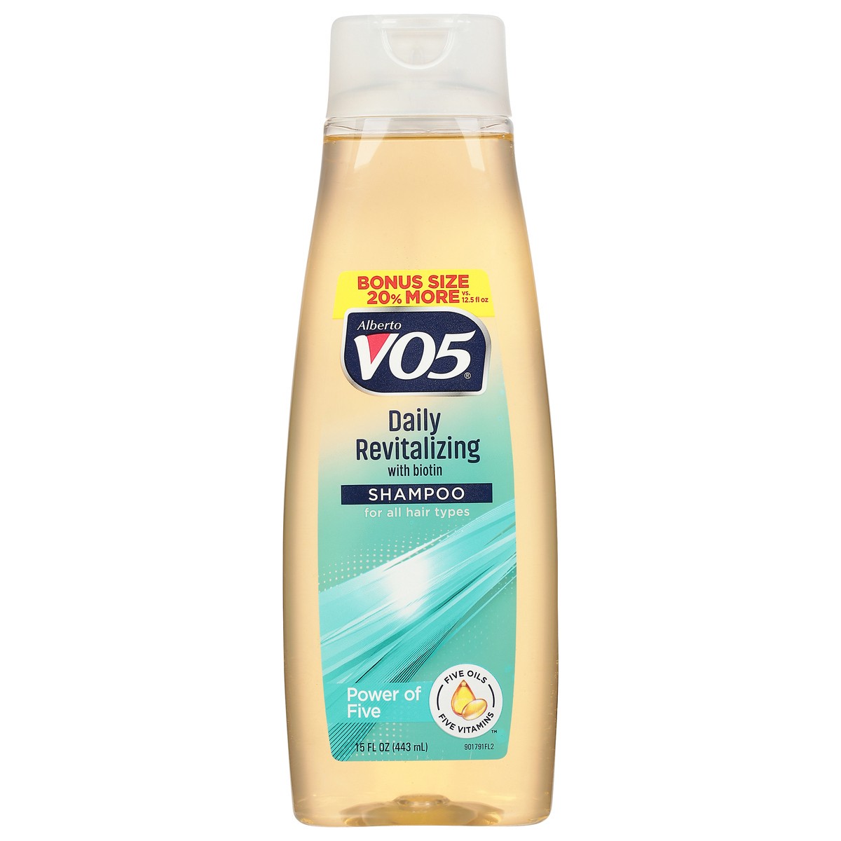 Daily revitalizing with biotin. Bonus size 20% more vs 12.5 fl oz. Shampoo for all hair types. Power of five. Five oils. Five vitamins. +5 Vitamins & Oils: Vitamin E; Biotin; Vitamin C; Vitamin B5; Vi…