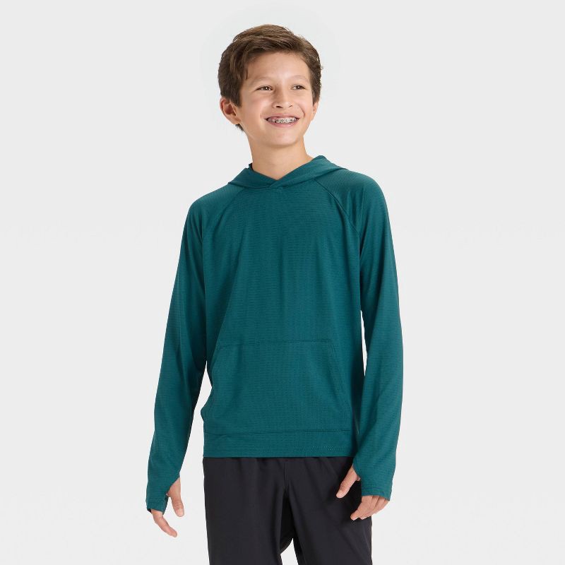 Why we're ALL IN:Long raglan-sleeve hooded tee designed in a solid hue. Made from a fabric blend of recycled polyester and spandex for cozy comfort and ease of movement. It features a kangaroo pocket …