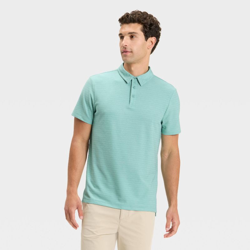 Why we're ALL IN:Pique polo shirt with a textured striped pattern. Designed with a collared neckline, three-button placket front and short sleeves for a classic look. Crafted from a lightweight fabric…