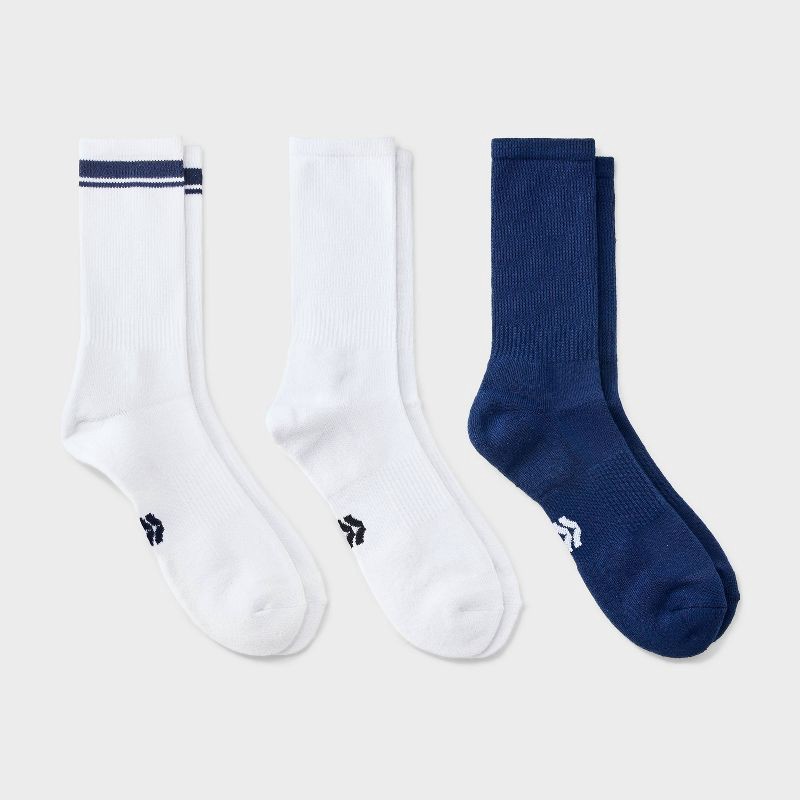 Why we're ALL IN:Three-pair pack of striped tonal varsity crew socks offers versatile wear with sneakers, casual shoes and boots. Made from a moisture-wicking, midweight knit fabric blend of recycled …