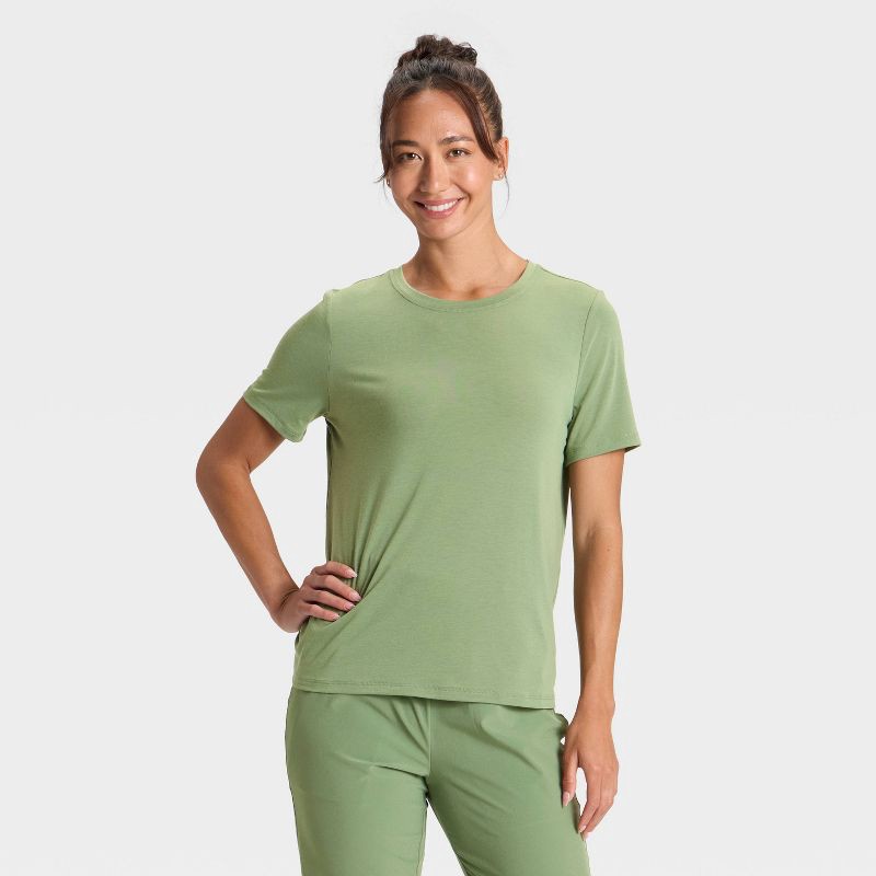 Why we're ALL IN:Legging-friendly T-shirt in a solid hue with a pullover design, crew neckline, tunic length and short sleeves. Made from a lightweight jersey fabric blend of recycled polyester, lyoce…