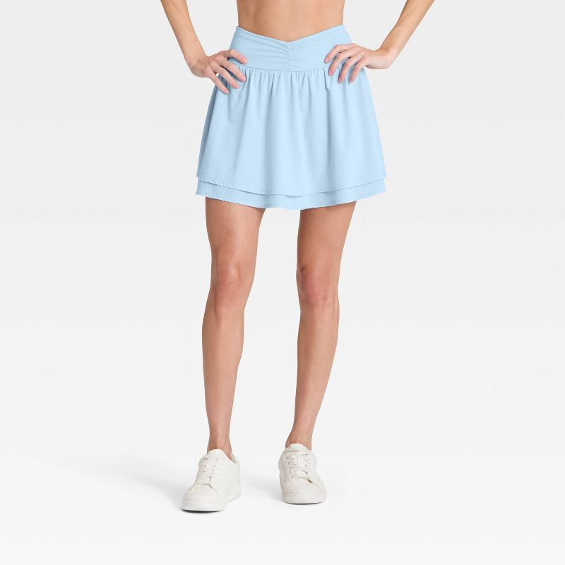 Why we're ALL IN:Woven shirred skort in a solid hue. Tailored in a high-rise, athletic-fit silhouette. Crafted from a lightweight fabric blend of recycled polyester and spandex for flexible comfort th…