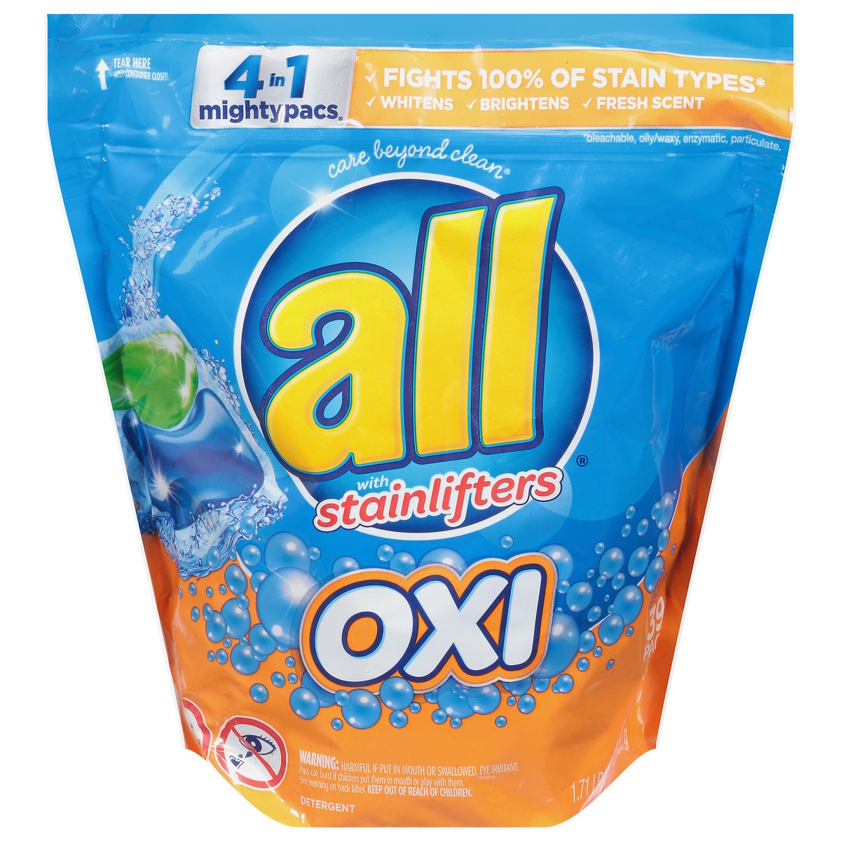 New! Care beyond clean. 4 in 1 Mighty Pacs: Fights 100% of stain types (bleachable, oily/wary, enzymatic, particulate); Whitens; Brightens; Fresh scent. Safe for HE washing machines. Dissolves complet…
