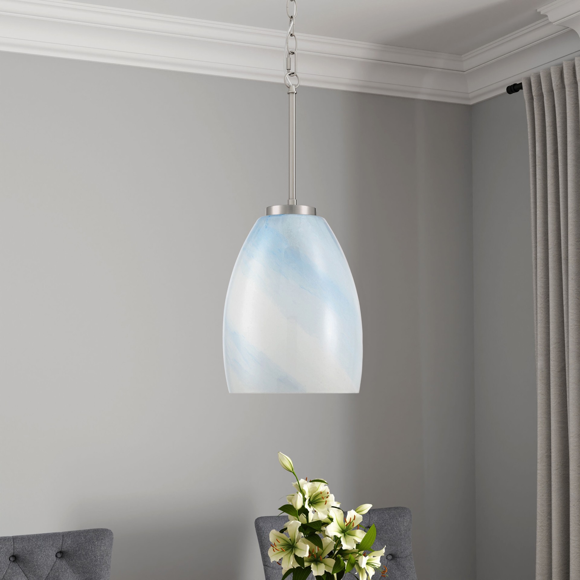 This brushed nickel pendant with blue glass adds a touch of sleek and artful style to your home. Requires one medium (E-26) base light bulb, maximum wattage of 60 (not included). This fixture is dry r…