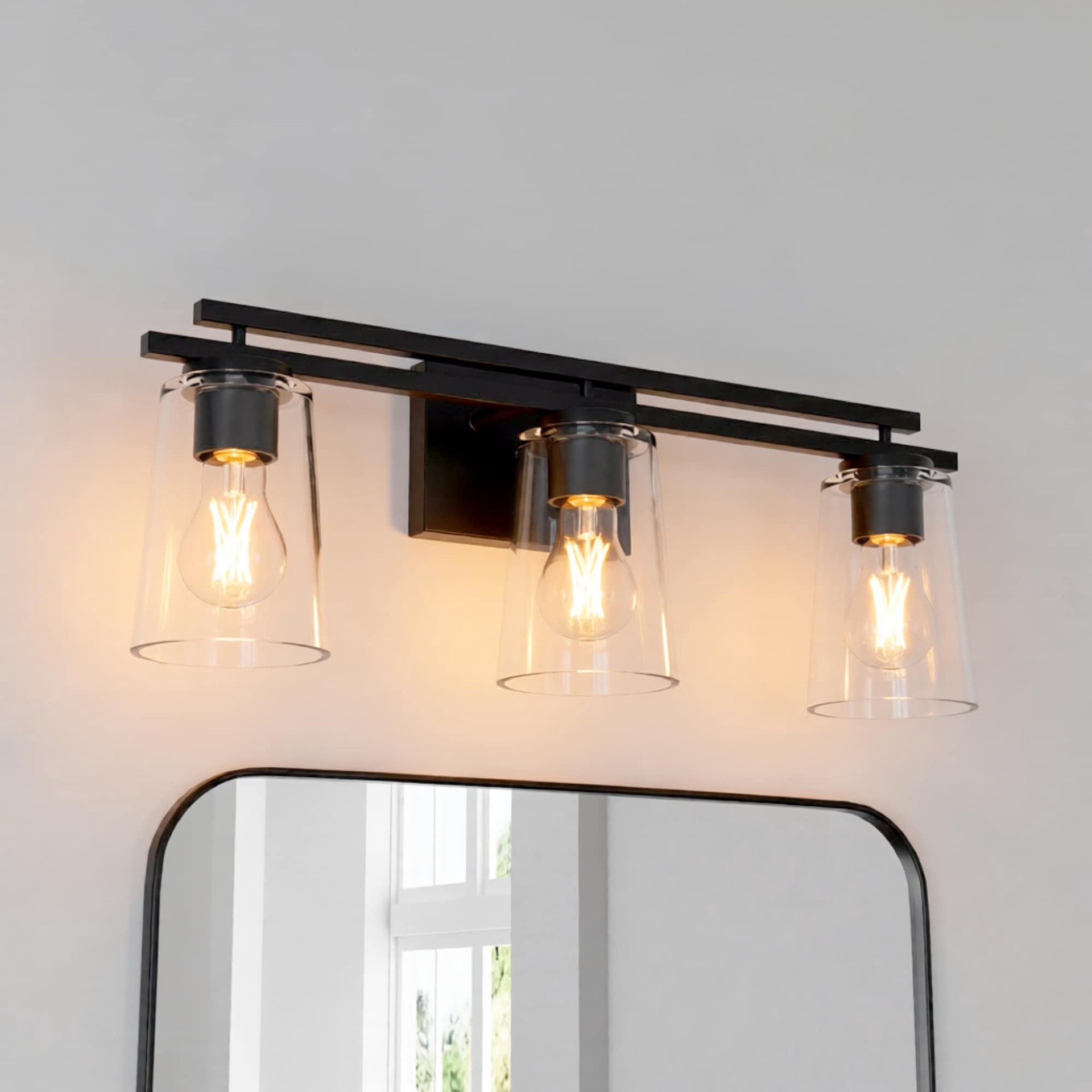 This vanity from the Houlton collection features a refined and updated design with an elagent black finish and clear glass shades. Requires three medium (E-26) base light bulbs, maximum wattage of 60 …