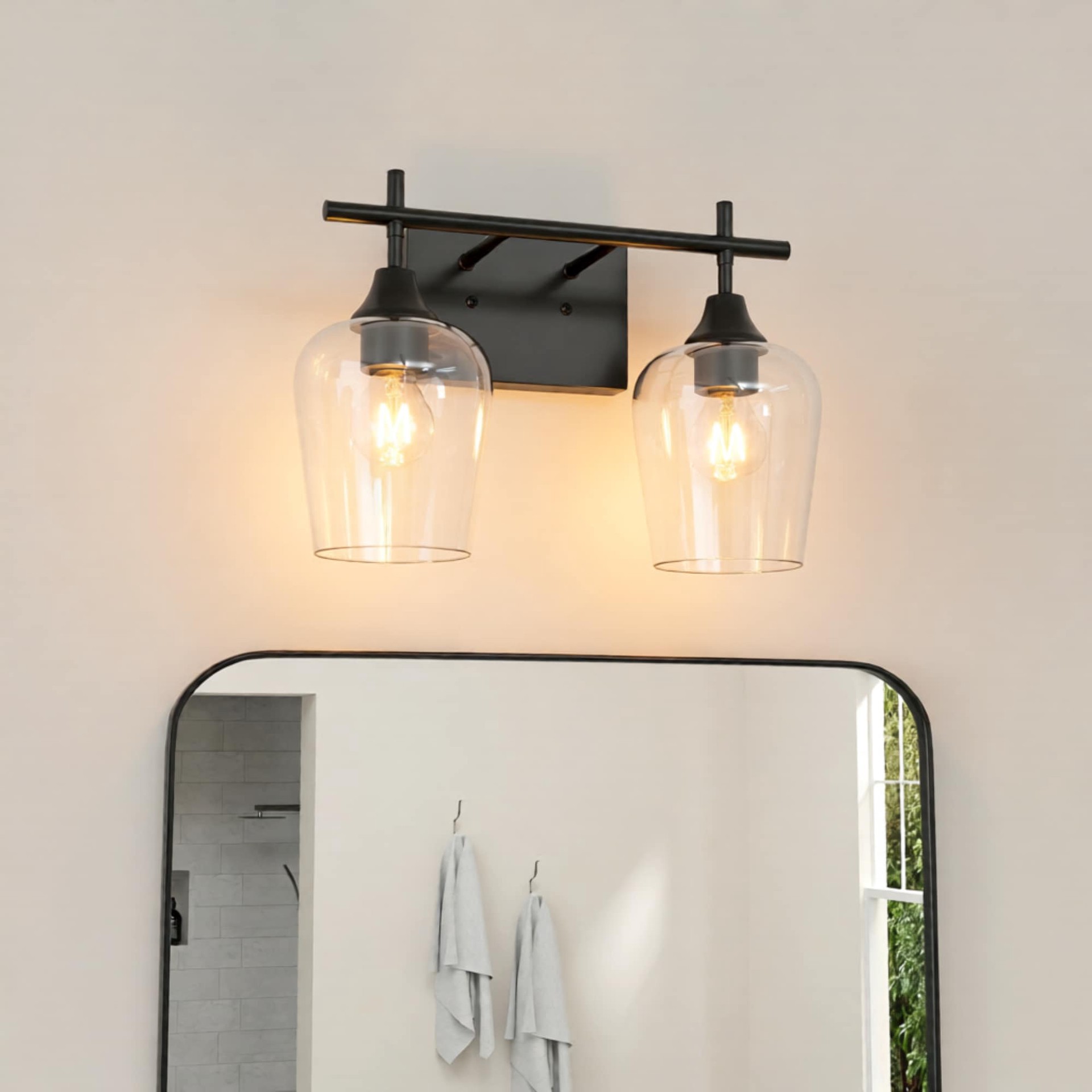 This vanity from the Meredith collection features a sleek minimalist design in black alongside large clear glass shades that beautifully diffuse light. Requires two medium (E-26) base light bulbs, max…