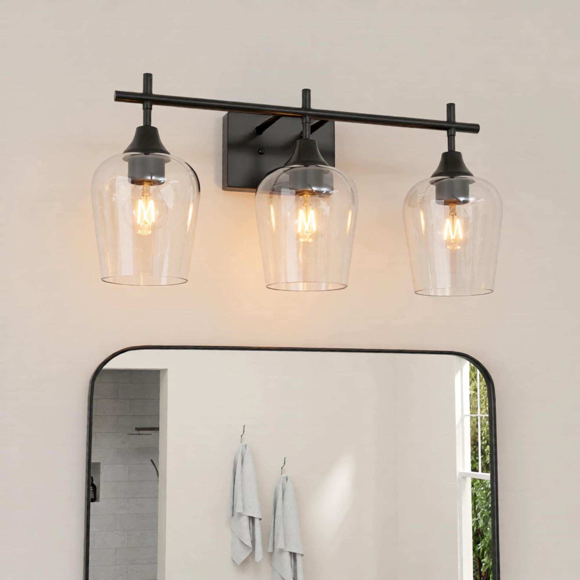 This vanity from the Meredith collection features a sleek minimalist design in black alongside large clear glass shades that beautifully diffuse light. Requires three medium (E-26) base light bulbs, m…