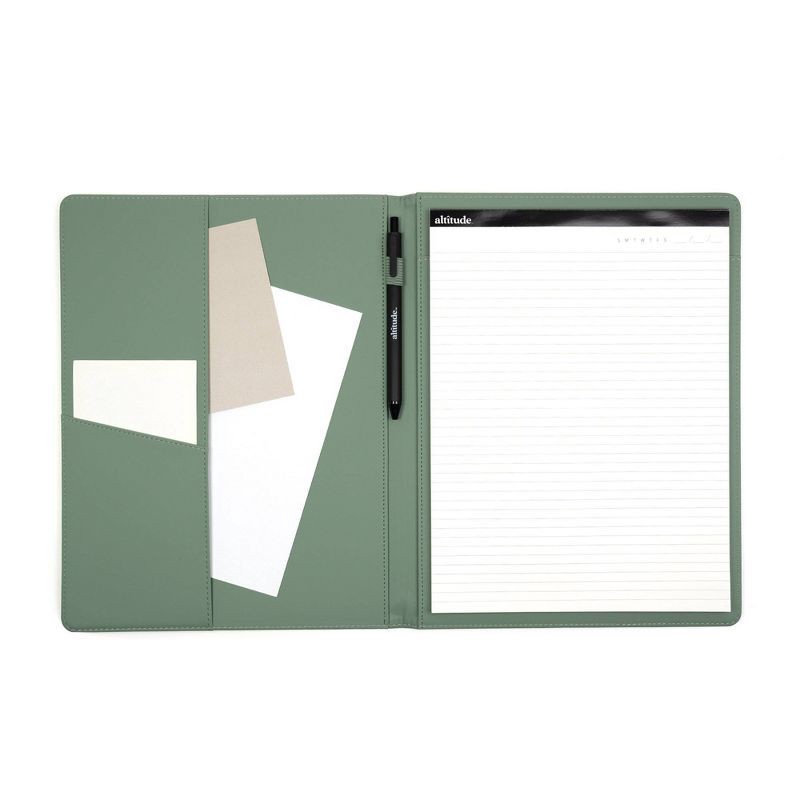This product is made from bamboo paper which is a renewable material, so you can stop your search for a sustainable padfolio. Our dark sage padfolio with a soft, vegan leather cover includes 1 pen loo…