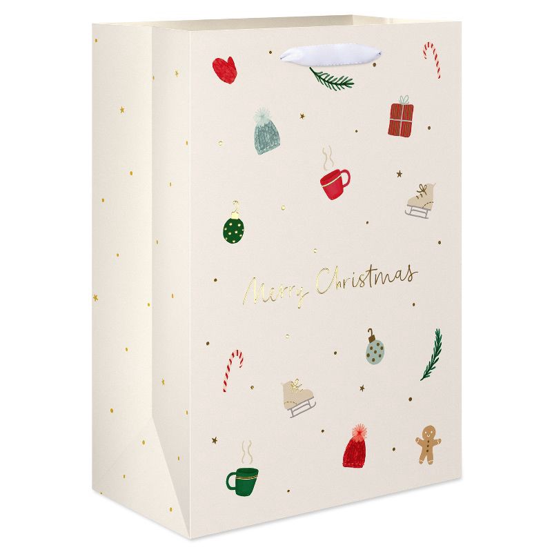 - This American Greetings medium gift bag features a 'Merry Christmas' message adorned with playful Christmas icons like gifts, a gingerbread man, and a steaming mug.