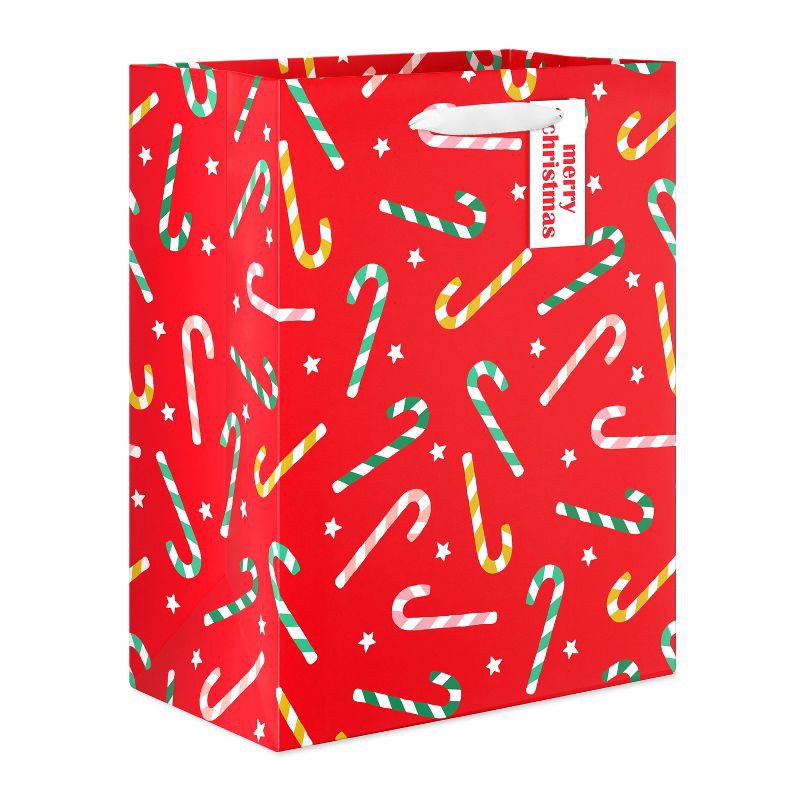 - This American Greetings large Christmas gift bag features multicolored candy canes with an attached tag.