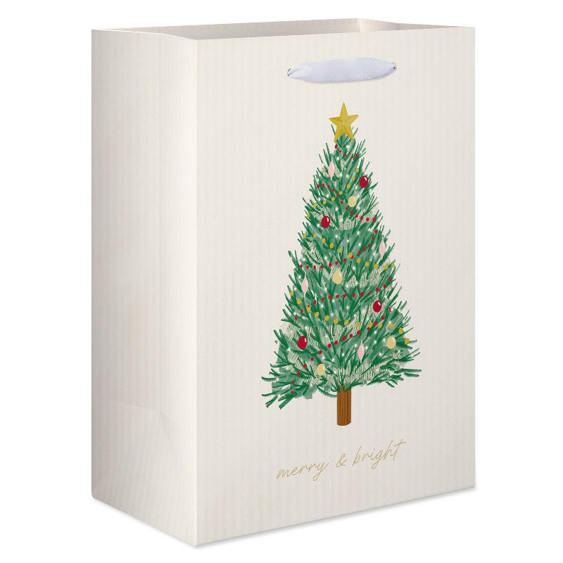 - This American Greetings large gift bag features a beautifully illustrated Christmas tree adorned with colorful ornaments and a golden star, along with the festive greeting 'merry & bright'.
