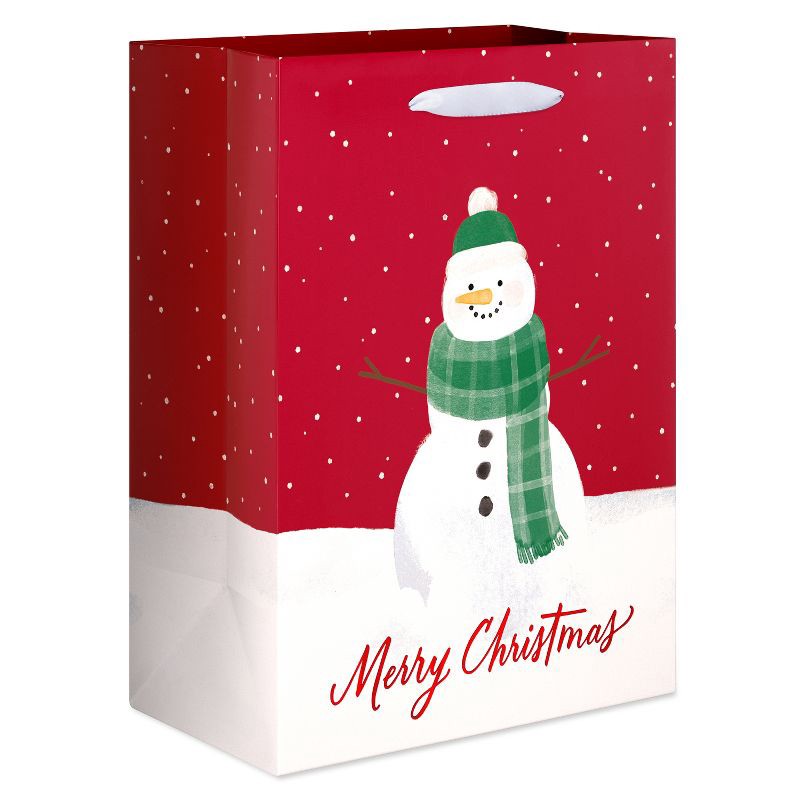 - This American Greetings large Christmas gift bag features a charming snowman wearing a green scarf against a festive red background.
