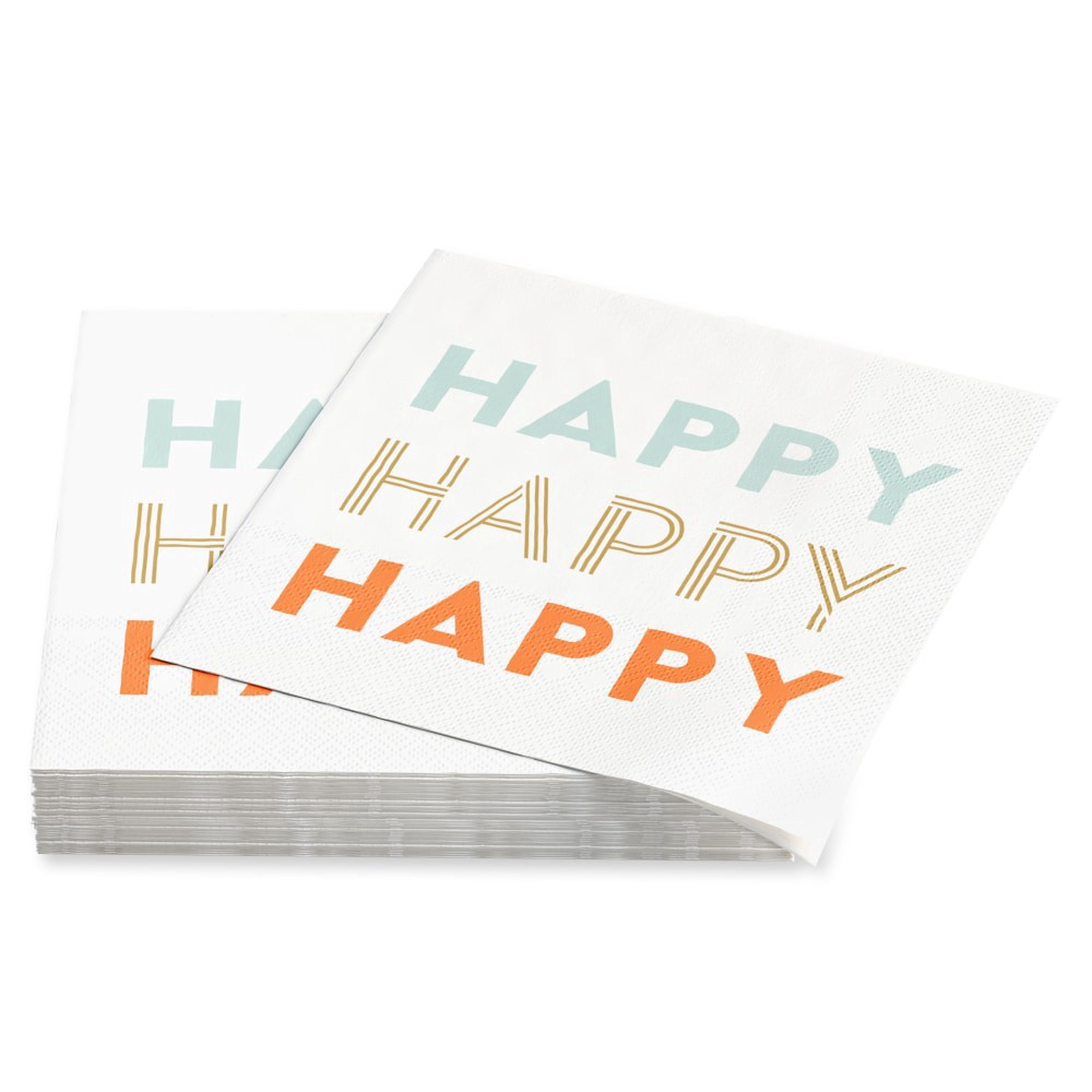 Liven up any celebration with these beverage napkins! The front features a fun lettering design that reads HAPPY HAPPY HAPPY in shades of green, pink, and red on a white background. These napkins make…